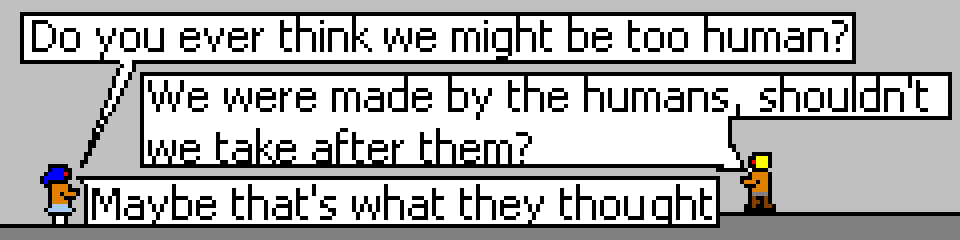 One technique I’ve been using a lot in WEX is crushing an image to a fraction of the original size and then indexing it to web colours. This has largely been in the backgrounds as a way to hide my own artistic limits/laziness making these and hide the fact I’m using Krita brushes that probably didn’t exist back in 2000 because Krita came out much later. I’ve been looking into using a more era appropriate art program for future paintings.